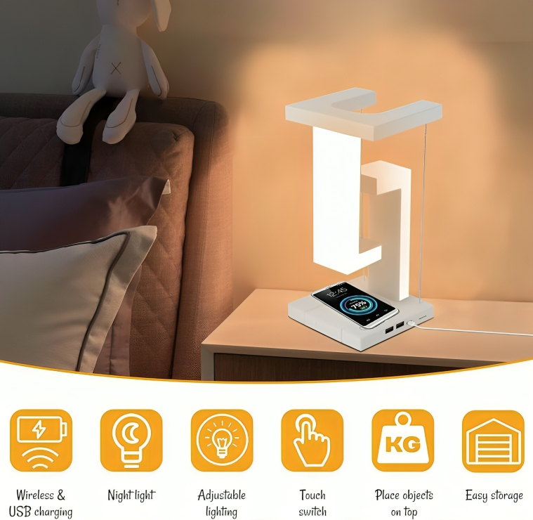 This innovative table lamp combines anti-gravity suspension with stepless dimming for smooth, customizable lighting. It also features a built-in wireless charger and USB power, blending functionality with stylish design. Perfect as a romantic night light and a unique decorative piece for any space.
